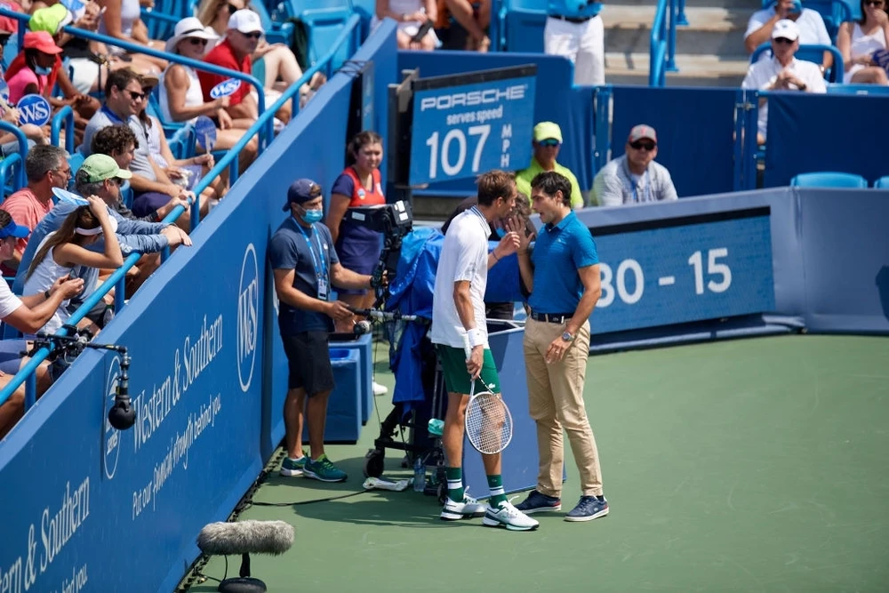 Sự cố xảy ra ở set hai, trong một pha Medvedev chạy để cứu bóng cuối sân, anh lao vào và hất đổ chiếc máy quay xuống đất. Tay vợt số 2 thế giới bước đến bắt tay nhân viên ghi hình, trong khi trọng tài chính chạy tới để đảm bảo cả hai đều ổn.