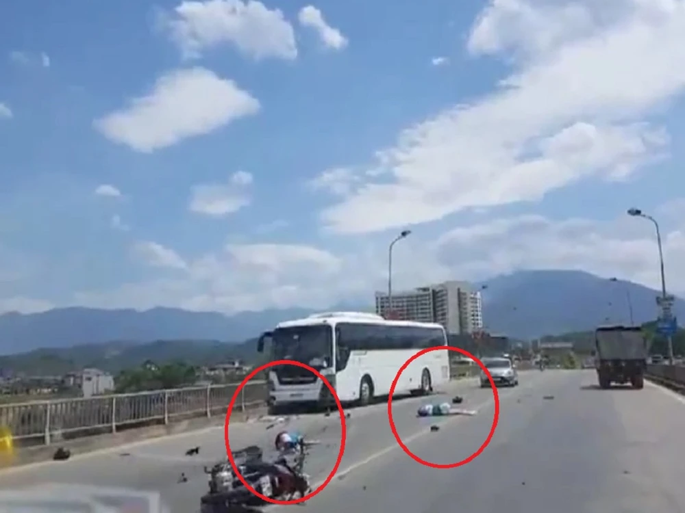 Cú va chạm cực mạnh khiến đôi nam nữ đi xe máy văng xuống đường, bất tỉnh. Chiếc xe máy bị vỡ vụn, các mảnh vỡ bay tung tóe trên mặt cầu. Xe khách cũng bị hỏng phần đầu.