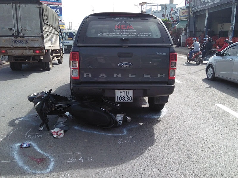 Sáng 12-6, ô tô bán tải biển số TP.HCM chạy trên quốc lộ 1 hướng từ miền Tây đi TP.HCM. Khi cách vòng xoay An Lạc, quận Bình Tân khoảng 50 m thì xảy ra va chạm với xe máy của người phụ nữ cầm lái chạy cùng chiều. Vụ việc khiến xe máy của cô gái loạng choạng rồi ngã ra đường.