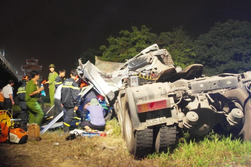 Tại hiện trường, phần đầu kéo và rơmoóc đứt rời, bẹp dúm, than củi trên xe đổ ngổn ngang. Tài xế xe tải đầu kéo kẹt cứng trong cabin.