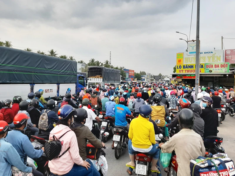 Ùn tắc nghiêm trọng đường lên cầu Rạch Miễu dịp Tết Nguyên đán 2021. Ảnh: ĐH