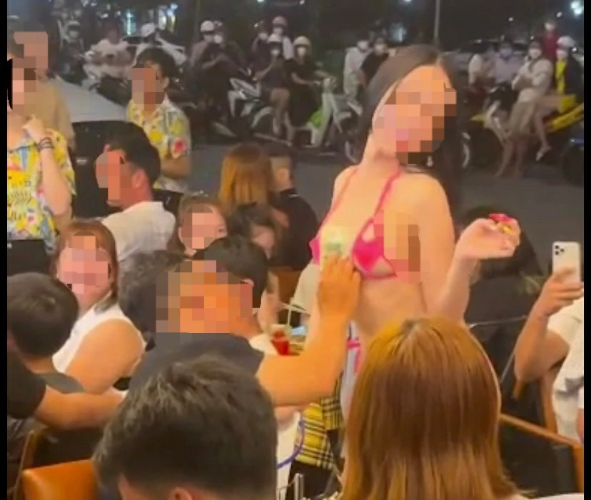 Người chuyển giới mặc bikini biểu diễn phản cảm tại quán ốc. Ảnh: Cắt từ clip