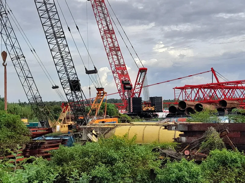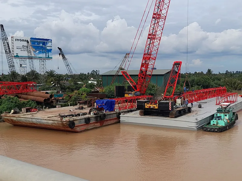 Hai sà lan trọng lượng 3.000 tấn neo đậu và hoạt động cẩu thiêt bị cơ giới từ bãi tập kết xuống sà lan trong hành lang cầu Rạch Miễu. Ảnh: Đông Hà