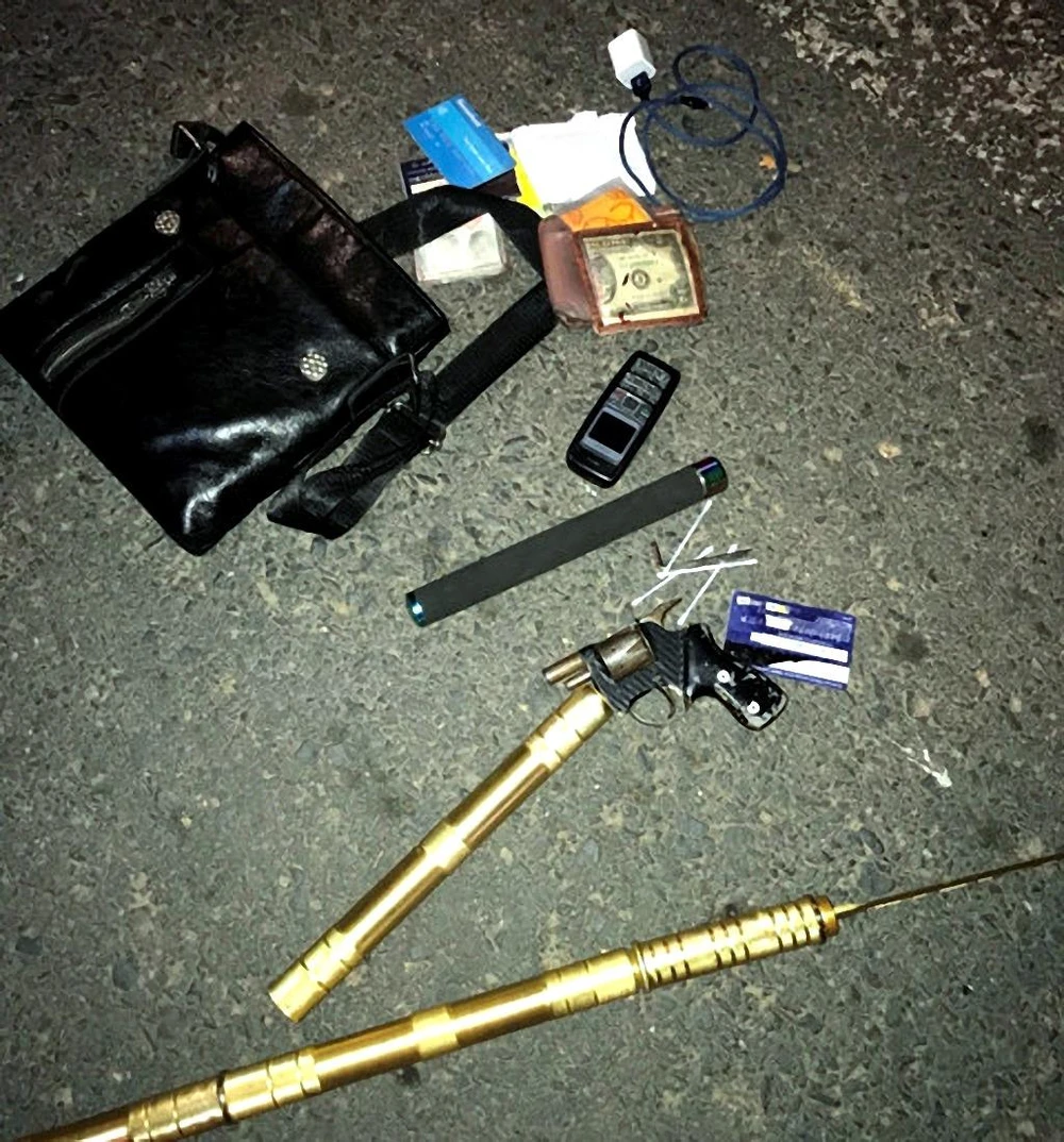 Qua kiểm tra, lực lượng chức năng phát hiện những người trên xe mang theo 1 súng tự chế, 8 viên đạn, 1 thanh đao tự chế, 1 con quay tự chế, 1 bọc nhỏ nghi chứa heroin và bộ công cụ sử dụng ma túy.