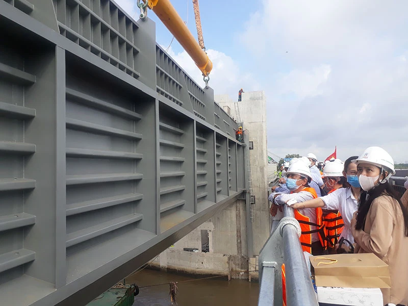 "Cửa van này có khẩu độ hơn 40 m, cao 8,5 m được xem là cửa van ngăn triều lớn nhất Việt Nam hiện nay. Hiện toàn dự án chúng tôi đã lắp đặt được 6/11 cửa van lớn. Dự án đạt 87-88% khối lượng, dự kiến đến tháng 12 sẽ đưa vào vận hành" - ông Nguyễn Tâm Tiến, Giám đốc Công ty Trung Nam BT 1547 (chủ đầu tư) cho biết.