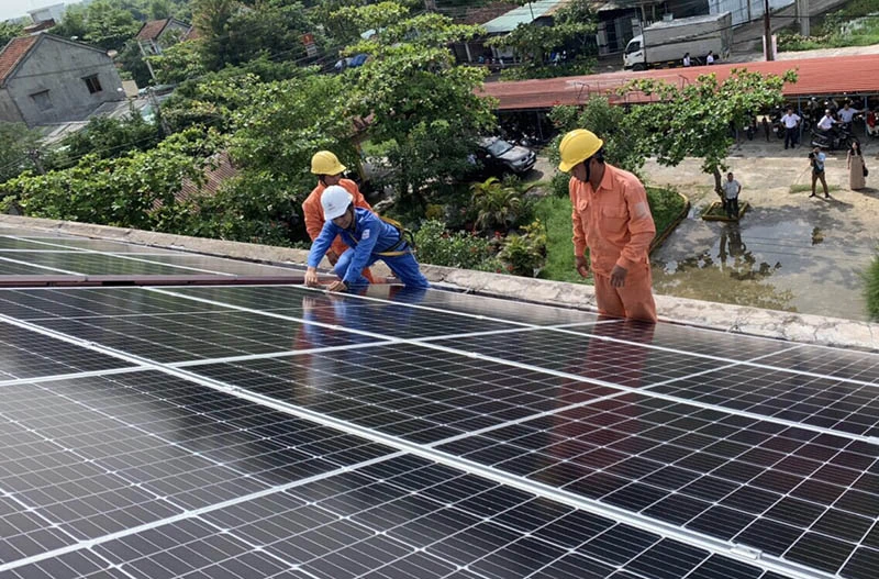 Lắp đặt hệ thống điện mặt trời trên mái nhà tại Trường THPT Trần Suyền. Ảnh: Công ty Điện lực Phú Yên.