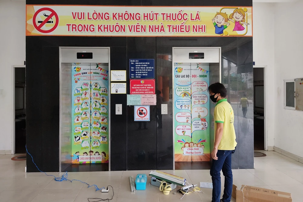 Hàng trăm hệ thống đèn UV diệt khuẩn được lắp đặt ở thang máy của các tòa nhà bệnh viện, chung cư, trung tâm y tế. Ảnh: THU TRINH