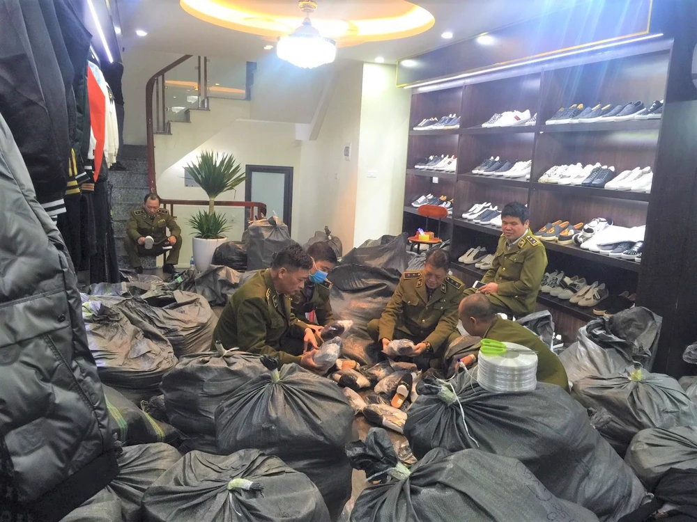 Tổ công tác 399 cùng lực lượng chức năng Hà Nội, Bắc Giang, Hải Dương triệt phá cửa hàng bán hàng giả mạo các thương hiệu nổi tiếng. Ảnh: THU TRANG
