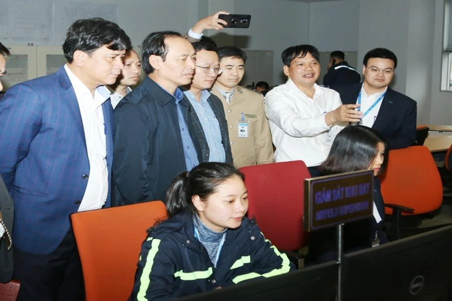 Thứ trưởng Bộ GTVT Lê Đình Thọ (thứ hai từ trái qua) đang kiểm tra hoạt động vận tải ở sân bay Nội Bài. Ảnh: V.LONG