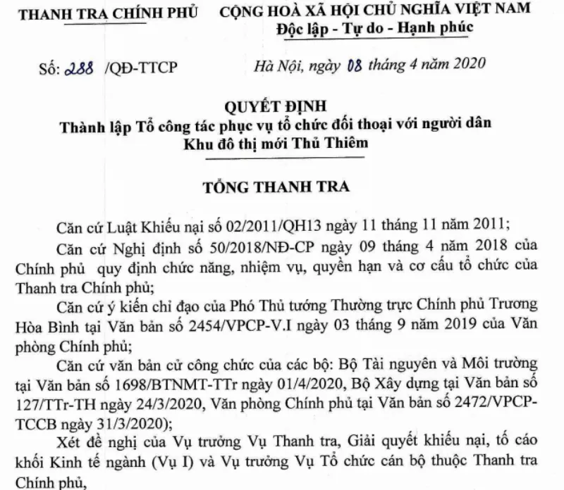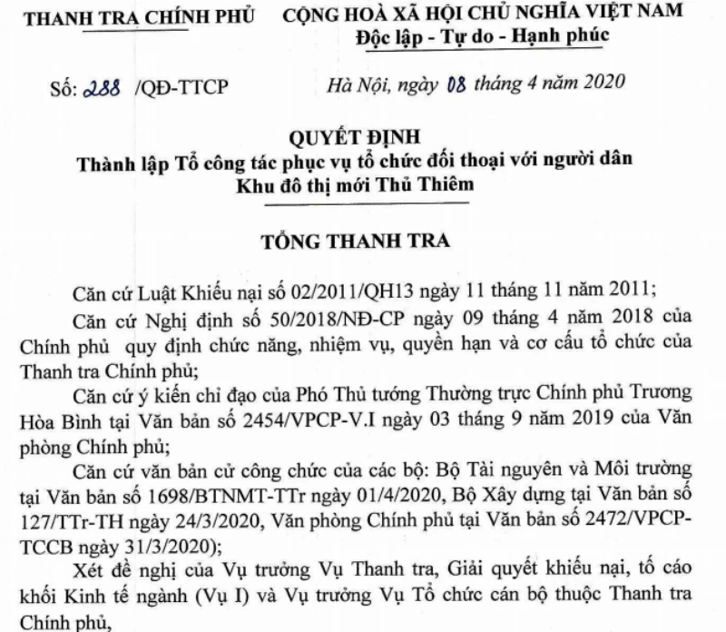 Thanh tra Chính phủ vừa ký quyết định thành lập tổ công tác phục vụ tổ chức đối thoại với người dân khu đô thị mới Thủ Thiêm (quận 2, TP.HCM).
