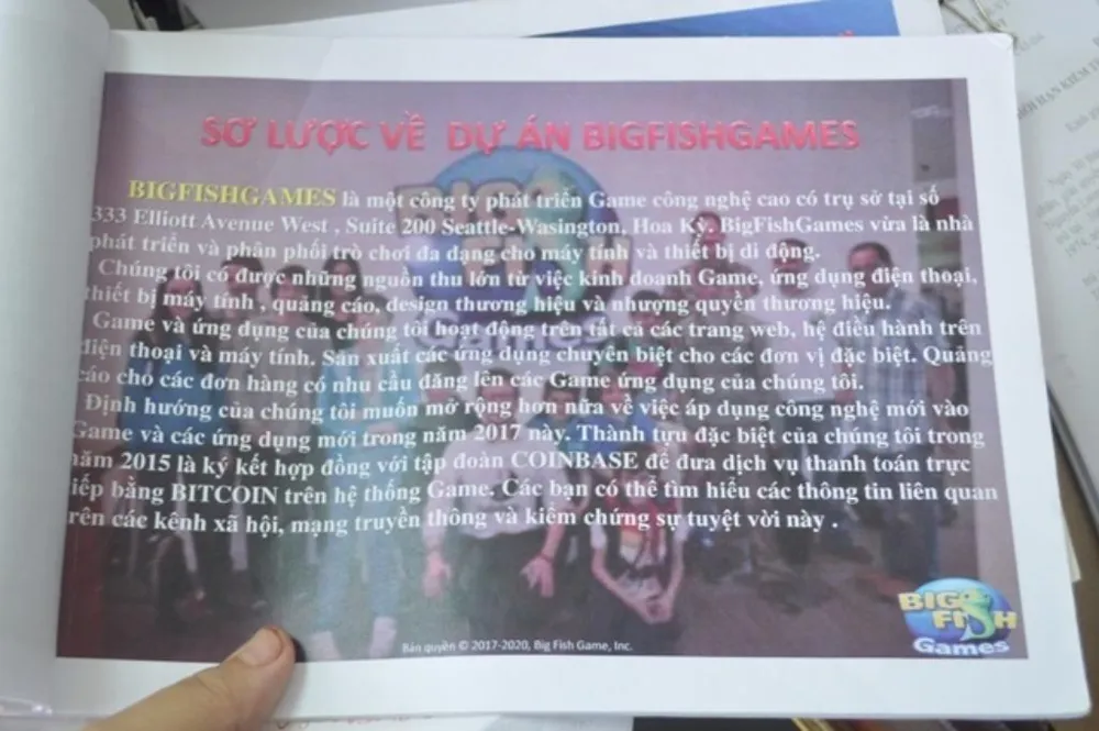 Theo thông tin từ phía người tố cáo, khoảng tháng 7-2017 nhóm của Hoá, Vân, Thế, Hùng lập trang mạng Big Fish Game Việt Nam, mục đích là giới thiệu, kêu gọi các nhà đầu tư mua các gói đầu tư.