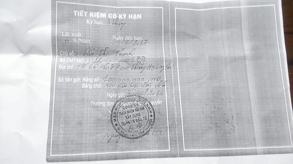 Bà Trần Thị Thanh, sống gần điểm giao dịch này cho biết ngày 3-10 đã gửi Hà 100 triệu đồng trong thời hạn ba tháng, lãi suất 6%/năm. Hà có tặng bà Thanh một bộ nồi nấu ăn inox và đưa cho một tờ bìa nhựa cứng màu xanh, chữ có thể bị xóa mờ, đóng dấu tên một công ty ở Hà Nội.