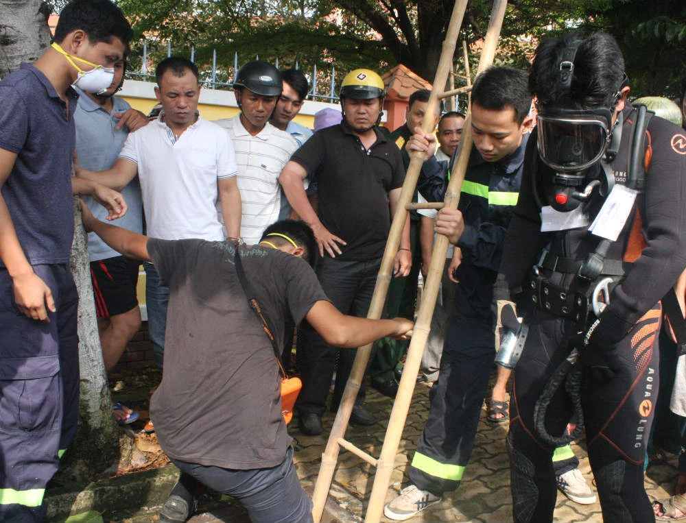 Lực lượng thợ lặn chuyên nghiệp PCCC xuống cống thoát nước để mò tìm.