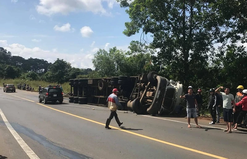 Theo đó, xe container biển số 61C-304.30 kéo theo rơ moóc 50R- 028.65 chở phế liệu sắt vụn do lái xe Nguyễn Chính Đoàn (SN 1984) cùng phụ xe Nguyễn Xuân Sơn (SN 1995, đều trú tại huyện Đồng Phú, tỉnh Bình Phước) di chuyển từ hướng Đắk Nông - Đắk Lắk. Đến khúc cua tại xã Trường Xuân, lái xe ôm cua làm cả rơ moóc và đầu kéo bị lật sang trái.