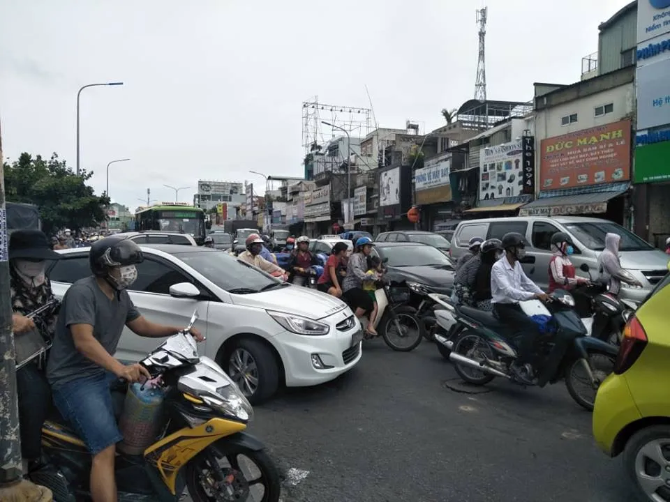 Các tuyến đường xung quanh từ cửa ngõ Tân Sơn Nhất cũng kẹt cứng, ô tô và xe máy di chuyển nhích từng chút, rất khó khăn.