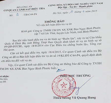 Ngoài ra, PC46 Bình Phước kết luận về ý thức chủ quan không đủ cơ sở xác định ông Long - Phó Giám đốc Công ty Bảo Ngọc buôn lậu gỗ vì trước khi nhập khẩu ông Long đã có công văn hỏi Tổng cục Hải quan và Chi cục Hải quan Hoa Lư cũng xác định hồ sơ nhập khẩu gỗ của Công ty Bảo Ngọc là đầy đủ, hợp lệ và cho thông quan.