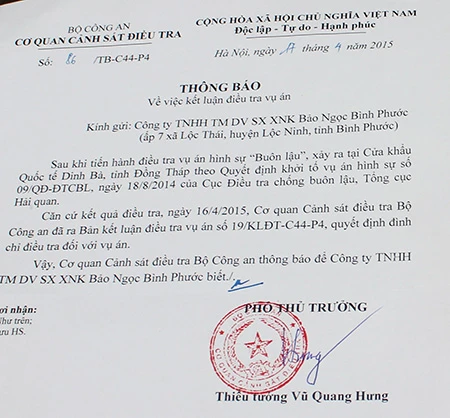 C44 cũng chuyển giao hồ sơ vụ án buôn lậu ở cửa khẩu Hoa Lư cho PC46 - Công an tỉnh Bình Phước. Sau đó ngày 12-9, PC46 Bình Phước ra quyết định đình chỉ điều tra vụ án vì không cấu thành tội phạm. Theo PC46, kết quả trả lời ủy thác tư pháp của VKSND tỉnh Champasak (Lào) xác định TAND tỉnh Champasak đã thụ lý đơn khởi kiện của Công ty LoKo về hợp đồng mua bán gỗ với Công ty Bảo Ngọc. Việc mua gỗ giữa Công ty Bảo Ngọc với công ty bên Lào là có thật và không đủ cơ sở xác định Công ty Bảo Ngọc buôn lậu gỗ.