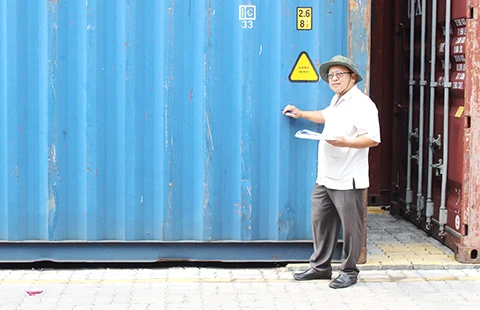 Ông Quách Phi Long, Phó Giám đốc Công ty Bảo Ngọc, đứng cạnh các container gỗ bị hải quan giữ tại cảng Cát Lái (TP.HCM). Ảnh: NGUYỄN ĐỨC