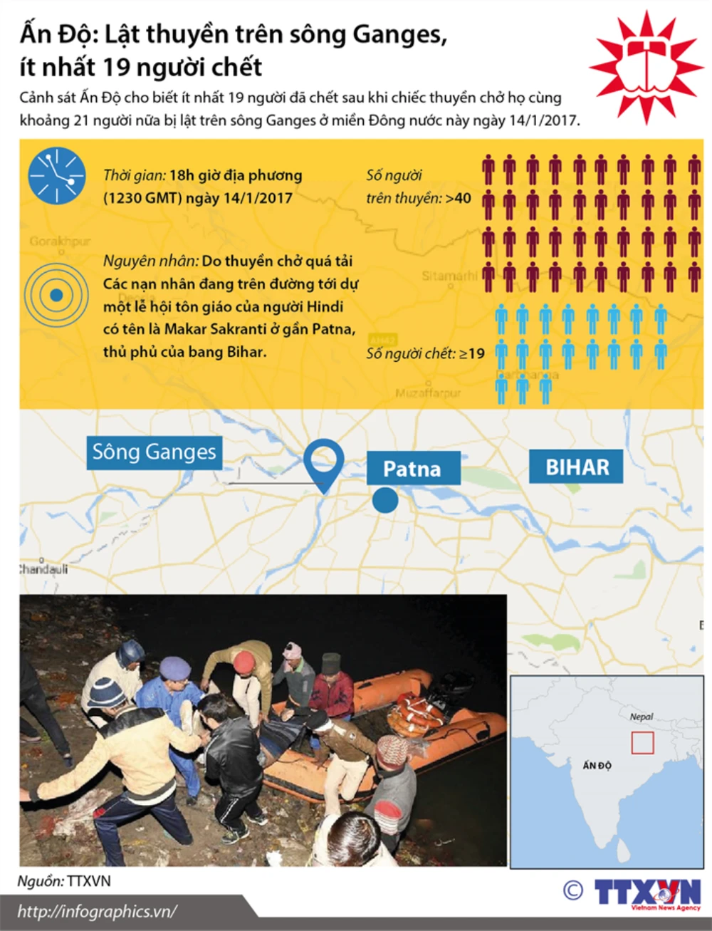Cảnh sát Ấn Độ cho biết ít nhất 19 người đã chết sau khi chiếc thuyền chở họ cùng khoảng 21 người nữa bị lật trên sông Ganges ở miền Đông nước này ngày 14-1.