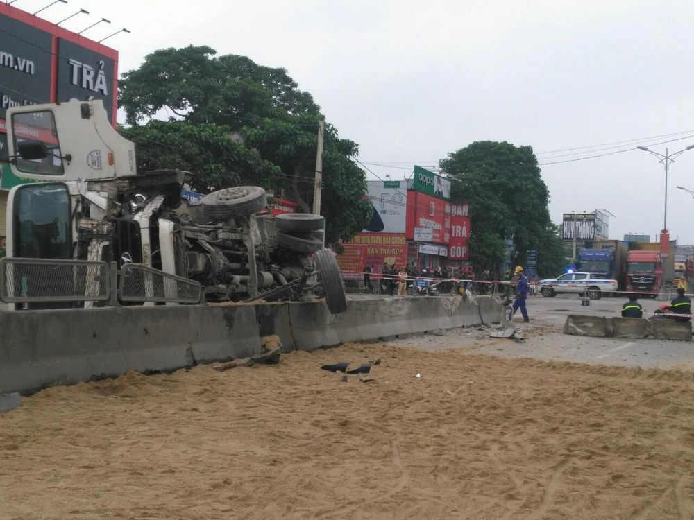 Vụ tai nạn xảy ra gần sáng 25-3, trên quốc lộ 1A (đoạn qua thị xã Hoàng Mai, Nghệ An) xe bồn chở xăng lật, xăng tràn ra mặt đường.