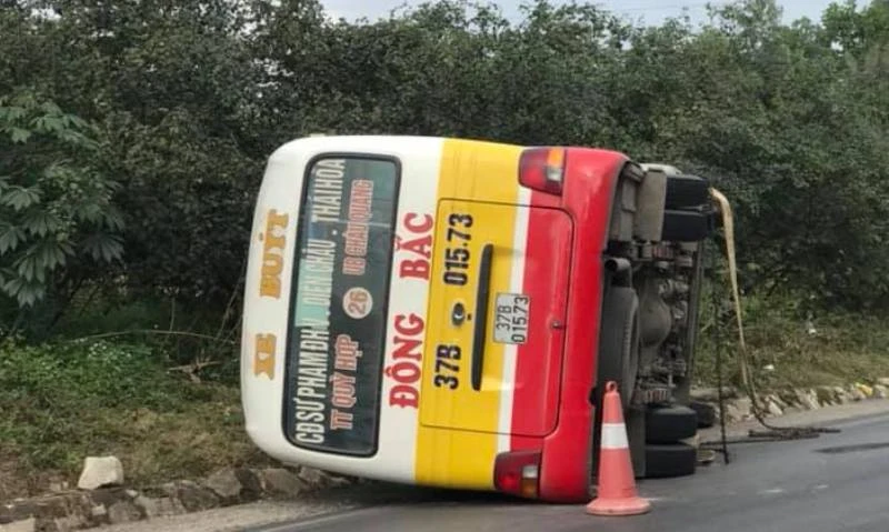 Vào thời điểm trên, xe buýt Đông Bắc 37B-015.73 chạy hướng thị trấn Quỳ Hợp - TP Vinh (Nghệ An) khi đến góc cua đã lật. Sự việc khiến rất đông hành khách bên trong hoảng loạn.