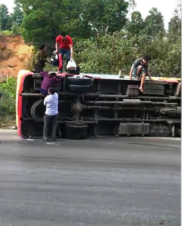 Hành khách phải ôm theo hành lý chui ra khỏi chiếc xe buýt lật.