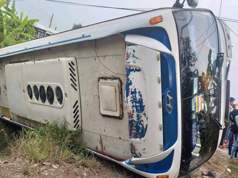 Khi xe chạy trên QL62 (đọan thuộc xã Thủy Tây, huyện Thạnh Hóa, Long An) xe bị sạt lề lật ngang làm 10 người bị thương, những công nhân khác đi trên xe cũng bị một phen hú vía.