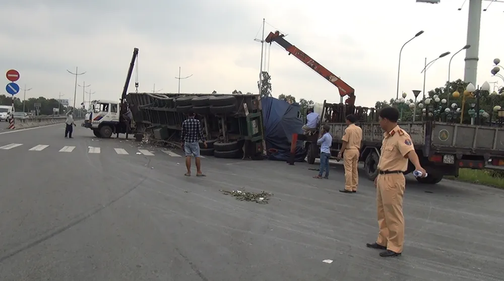 Lực lượng chức năng sau đó có mặt, một xe cẩu được điều đến kéo phương tiện ra khỏi hiện trường. Tuy nhiên do khối lượng hàng hóa đổ tràn ra đường lớn chưa được bốc dỡ kịp thời khiến giao thông qua khu vực đường dẫn vào cao tốc TP.HCM –Trung Lương gặp khó khăn nhiều giờ liền.