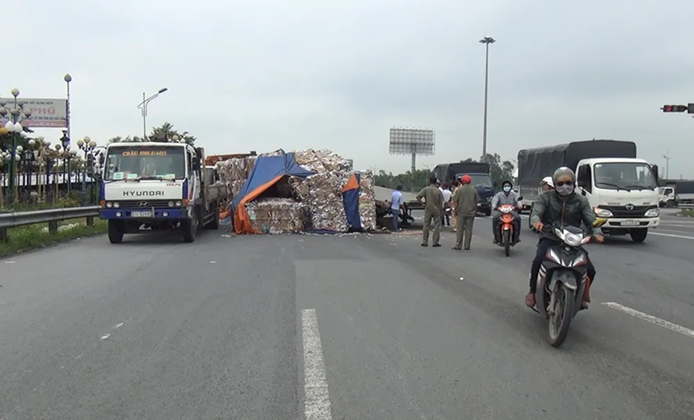 Khi đang vào giao lộ thì xe này loạng choạng rồi lật ngang. Toàn bộ hàng hóa là giấy vụn được ép chặt thành khối lớn chở trên rơ-moóc đổ tràn ra đường trong lúc nhiều phương tiện đang lưu thông cùng chiều.