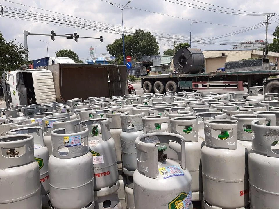 May mắn là tài xế và phụ xe chỉ bị thương nhẹ, các bình gas đều an toàn sau đó được gom vào lề đường.