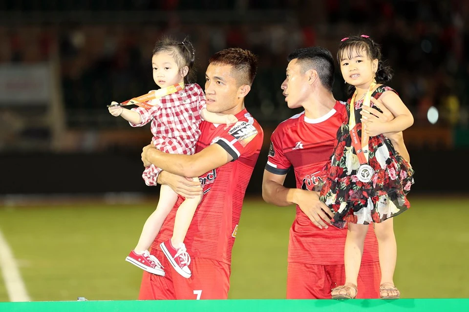 Tiền đạo Huỳnh Kesley (bìa trái) cùng con trai Kevin (bìa phải).