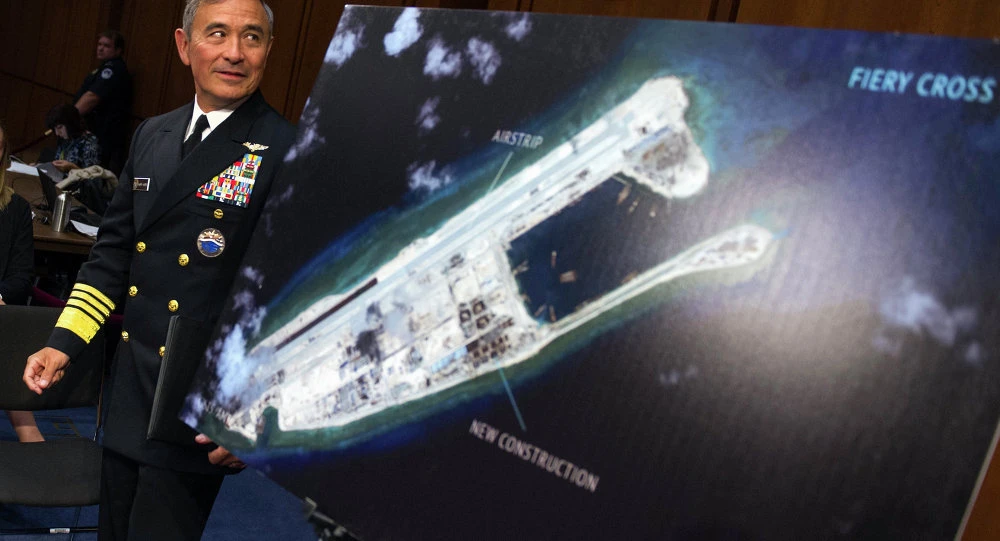 Tư lệnh hạm đội Thái Bình Dương Mỹ Harry B.Harris đi ngang qua bức ảnh đảo nhân tạo Trung Quốc xây dựng trái phép trên khu vực Đá Chữ Thập.