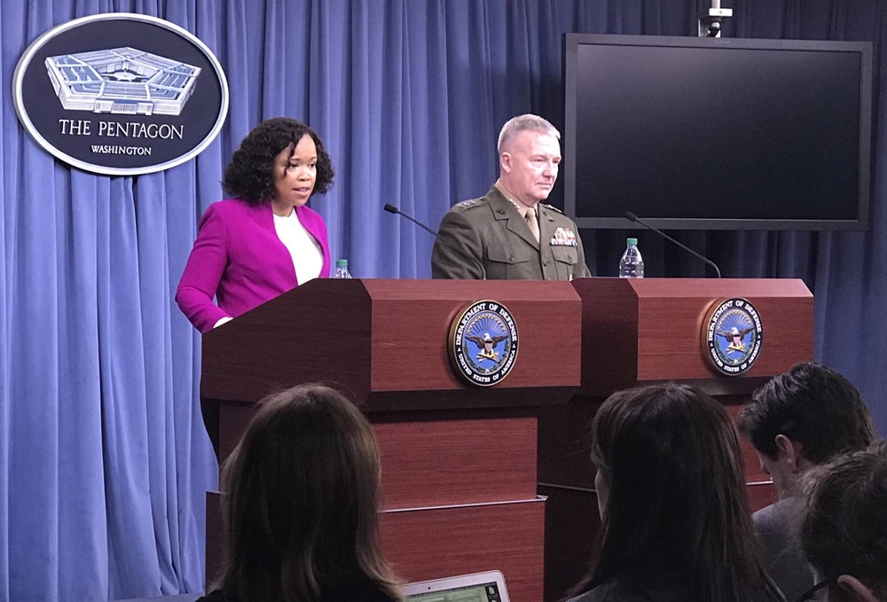 Bà Dana White và Thượng tướng Kenneth F. McKenzie trong buổi họp báo. Ảnh: Twitter