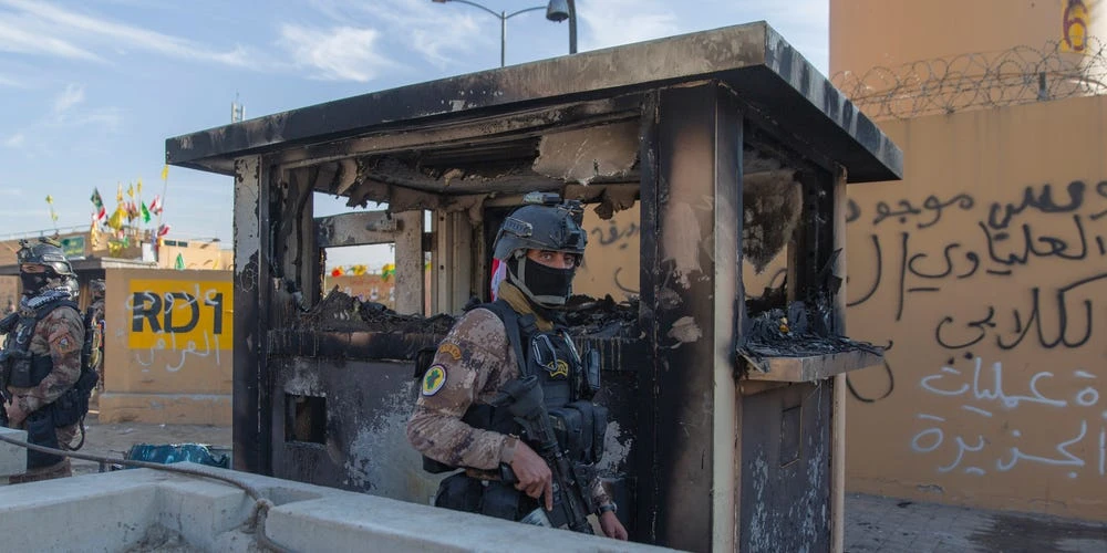 Binh sĩ Iraq được triển khai trước Đại sứ quán Mỹ tại Baghdad. Ảnh: Nasser Nasser/AP