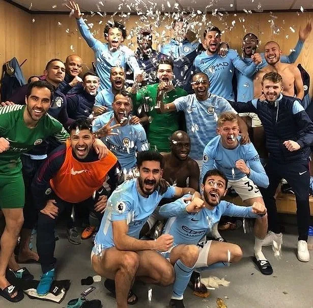 Cầu thủ Man. City ăn mừng trong phòng thay đồ.