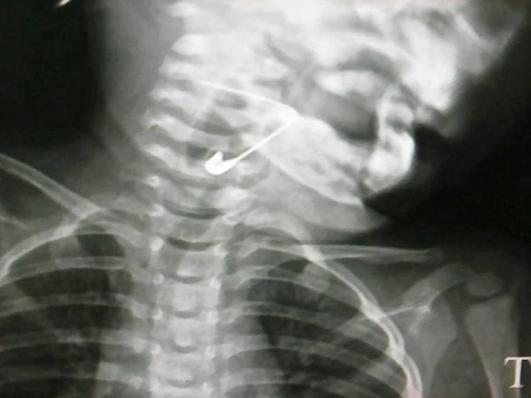 Mẹ cháu bé cho biết khi cháu đang ngồi chơi thì nghịch, nuốt cây kim băng được cài trên áo của cháu.