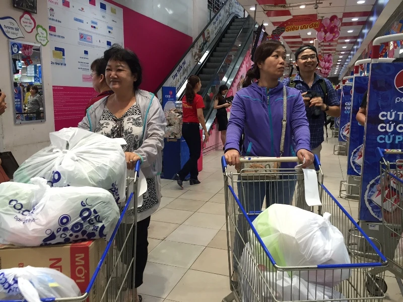 Ghi nhận tại siêu thị Co.opmart Lý Thường Kiệt (quận11) dù chỉ 10 giờ sáng nhưng hai bãi giữ xe phía trước đã để bảng đầy xe, khách phải đi xuống dưới tầng hầm. Bên trong siêu thị từng xe đẩy hàng của khách chất đầy các bao hàng. Khu vực thực phẩm tươi sống thu hút khách mua sắm nhất.