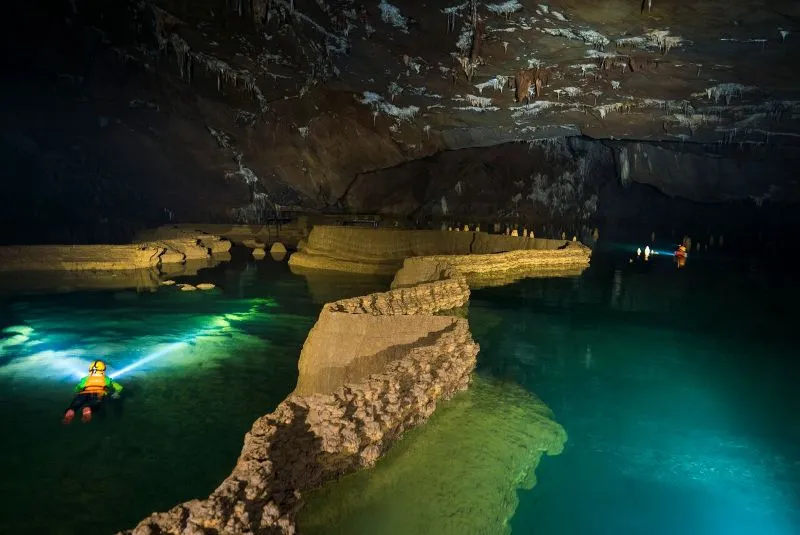 Khám phá Hang Va và Hang Nước Nứt, với hệ thống thạch nhũ và tháp đá vôi dưới nước độc đáo. Ảnh: Oxalis