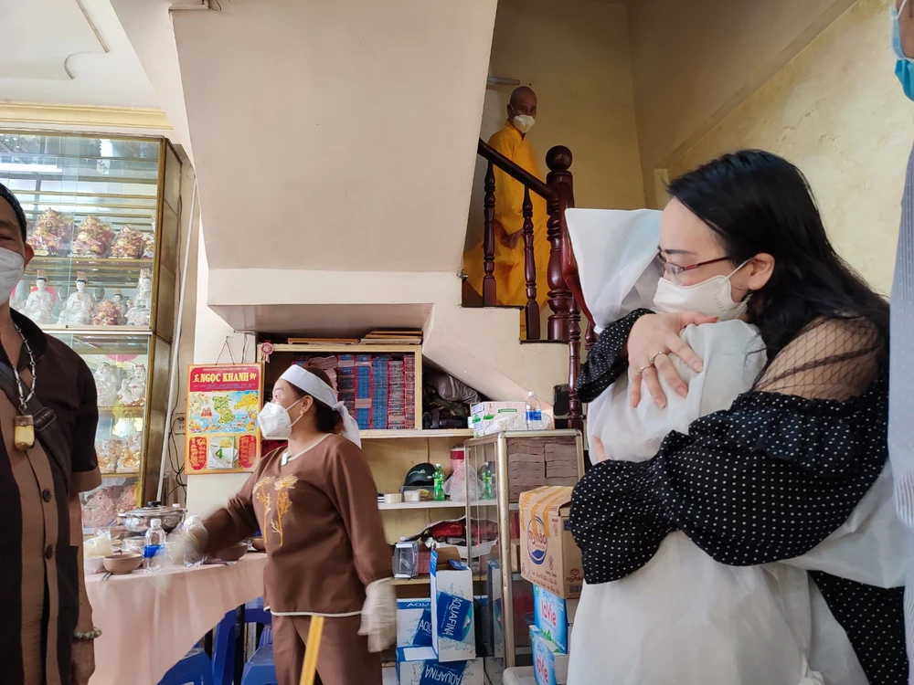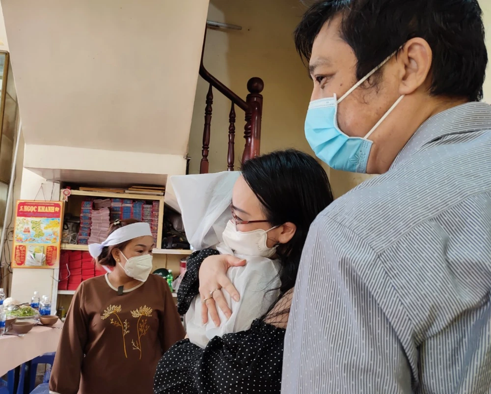 Người thân, đồng nghiệp ôm chặt Bình Tinh. Ảnh: NGUYỄN TRÀ