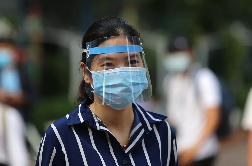 Các thầy cô làm nhiệm vụ đón học sinh tại cổng được trang bị thêm mặt nạ ngăn giọt bắn phòng dịch COVID-19.