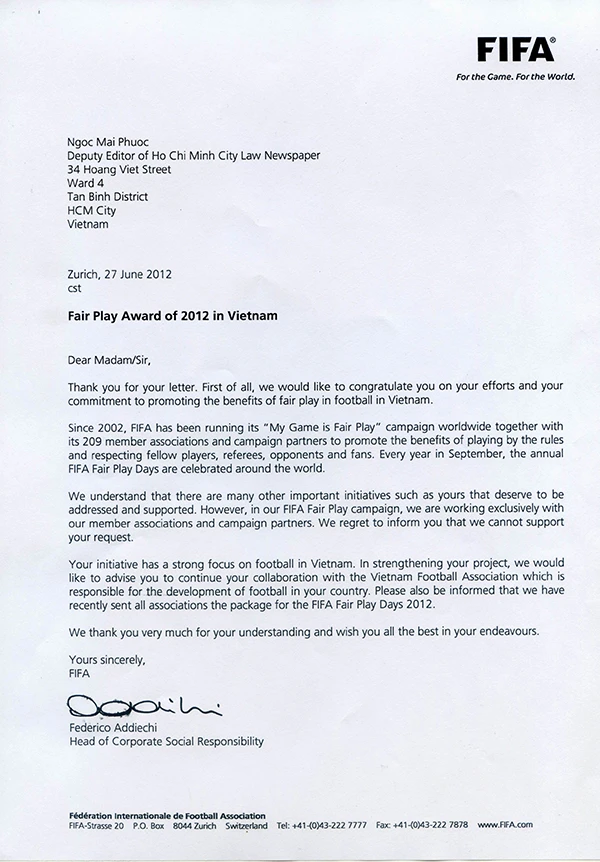 FIFA gửi thư chúc mừng và chia sẻ với ban tổ chức giải từ những ngày đầu hoạt động.