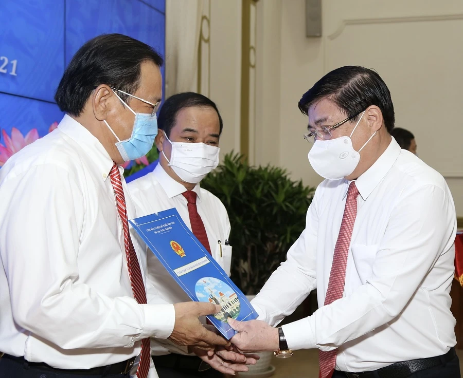 Chủ tịch UBND TP Nguyễn Thành Phong trao quyết định bổ nhiệm Phó Tổng biên tập Báo Pháp Luật TP.HCM cho ông Nguyễn Đức Hiển. Ảnh: HOÀNG GIANG
