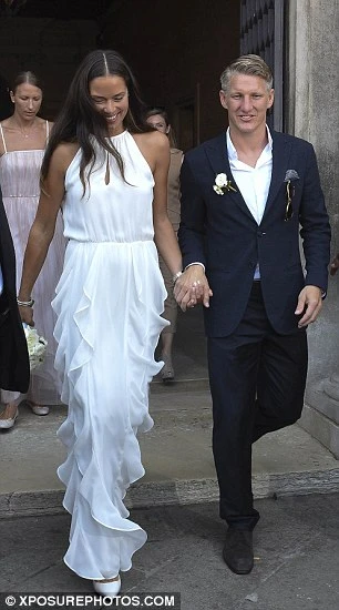 Chú rể Bastian Schweinsteiger dường như đã quên đi nỗi buồn thua trận ở bán kết vừa rồi. Anh lịch lãm trong bộ vest màu xanh với nụ cười viên mãn trên môi. Cặp vợ chồng tươi cười hạnh phúc. Lễ cưới của Bastian Schweinsteiger và Ana Ivanovic diễn ra tại Venice City Hall. Nơi này còn được gọi là Palazzo Cavalli.