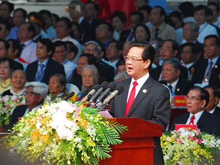 Thủ tướng Nguyễn Tấn Dũng đọc diễn văn kỷ niệm 40 năm ngày thống nhất đất nước. A3nh: HTD