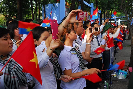 Vừa phất cờ vừa chụp hình lưu niệm. Ảnh: HTD