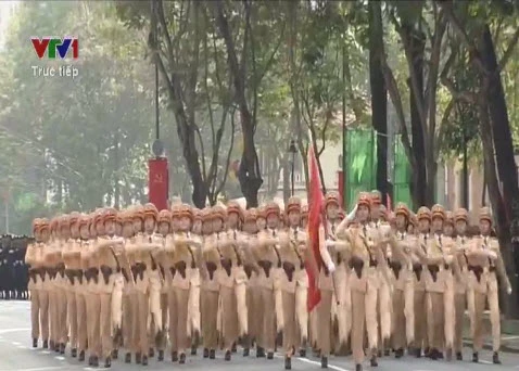 Tiếp đó là phần trình diễn của lực lượng công an nhân dân với các khối sĩquan, cảnh sát, cảnh sát giao thông, cảnh sát cơ động, phòng cháy chữa cháy, sĩquan công an TP.HCM, công an xã.
