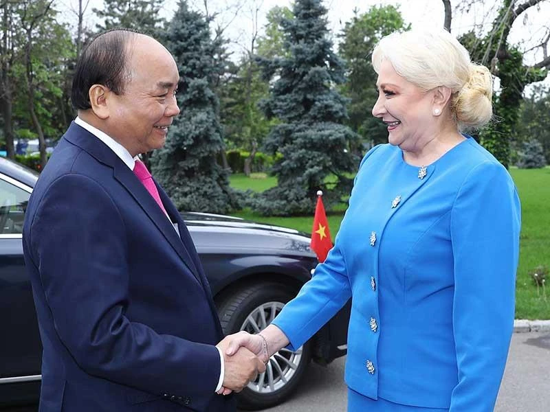 Thủ tướng Romania Viorica Dancila đón Thủ tướng Nguyễn Xuân Phúc. Ảnh: TTXVN