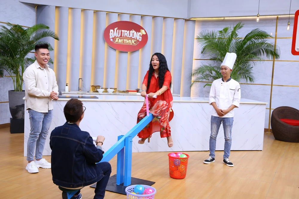 Khách mời sẽ phải vừa chơi bập bênh, vừa ném bóng vào rổ, ai ghi được nhiều điểm nhất sẽ là người chiến thắng. Ảnh: JET