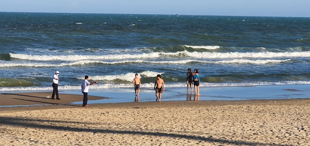 Dưới biển Bãi Sau, lực lượng của Ban quản lý (BQL) các khu du lịch (KDL) cũng tổ chức chia ca nhắc nhở người dân hạn chế tắm biển.