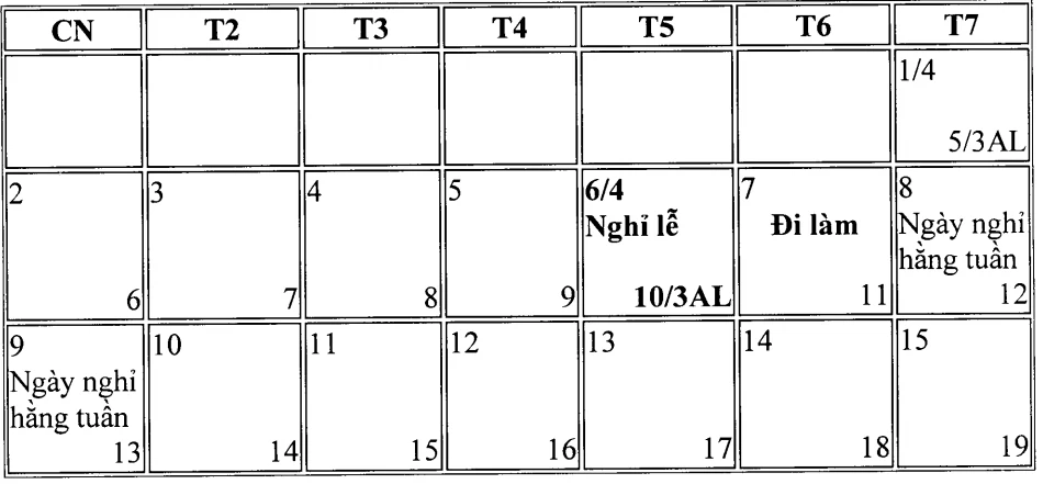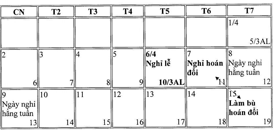 Trước đó, Bộ LĐ-TB&XH có trình Chính phủ hai phương án nghỉ lễ giỗ tổ Hùng Vương. Cụ thể, phương án 1: Nghỉ một ngày vào thứ Năm (ngày 6-4); phương án 2: Hoán đổi một ngày làm việc với một ngày nghỉ hằng tuần. Đi làm thứ Bảy (ngày 15-4) để nghỉ thứ Sáu (ngày 7-4). Tổng số ngày nghỉ là bốn ngày liên tiếp, từ thứ Năm đến hết Chủ nhật.